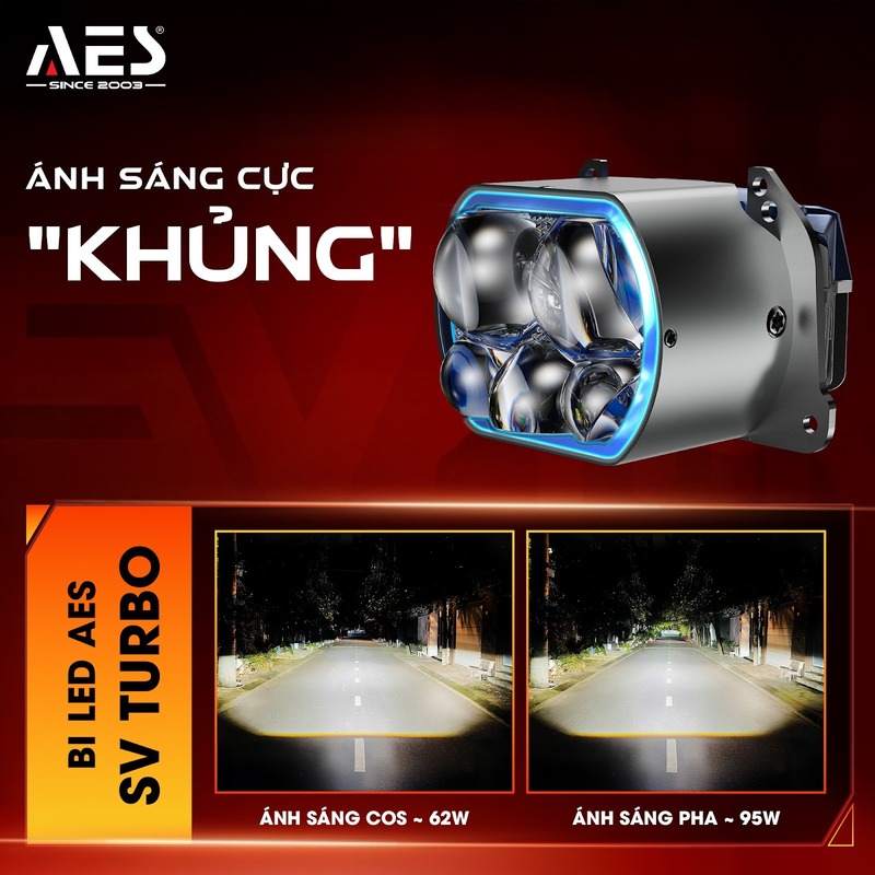 Bi LED AES SV Turbo sở hữu cấu hình ánh sáng ấn tượng với thiết kế X2 nguồn sáng Cos và X3 nguồn sáng Pha, tạo nên hiệu suất chiếu sáng vượt trội. Hệ thống 5 thấu kính được bố trí khoa học, trong đó 2 thấu kính phía trên đảm nhiệm Cos và 3 thấu kính phía dưới hỗ trợ Pha. Nhờ cấu hình này, luồng sáng được phân bổ rộng, rõ nét và có độ phủ tốt trên toàn bộ làn đường. Tâm pha dạng elip hội tụ giúp ánh sáng chiếu xa mạnh mẽ, hỗ trợ quan sát ở khoảng cách lớn. Đây được xem là một trong những thiết kế cấu hình ánh sáng ấn tượng trong phân khúc bi LED hiện nay.