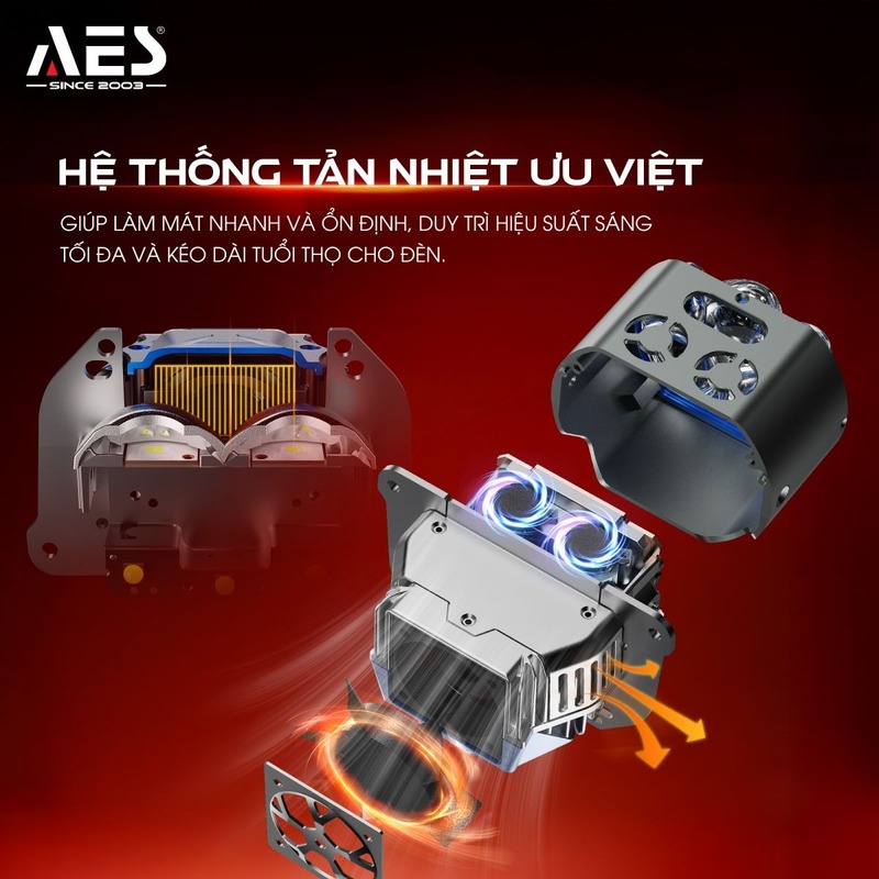 Để đảm bảo hiệu năng hoạt động ổn định, bi LED AES SV Turbo được trang bị hệ thống tản nhiệt tối ưu với nhiều vật liệu cao cấp. Phần Cos sử dụng khối tản nhiệt bằng đồng kết hợp đế đồng DTP giúp truyền nhiệt nhanh chóng từ chip LED ra bên ngoài. Nhiệt lượng sau đó được làm mát bởi quạt hiệu suất cao kích thước 45mm, duy trì nhiệt độ ổn định khi đèn hoạt động liên tục.