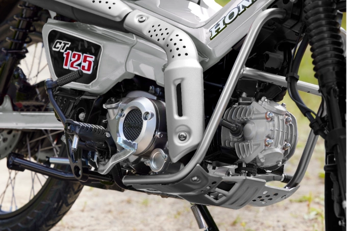 Ngoài ra, Honda còn trang bị cho CT125 khung bảo vệ gầm chắc chắn, giúp hạn chế va đập khi di chuyển qua những cung đường gồ ghề. Bộ lốp gai nguyên bản mang đến độ bám vượt trội, tăng khả năng kiểm soát trong mọi điều kiện địa hình. Hệ thống phanh ABS trên bánh trước kết hợp phanh tang trống phía sau đảm bảo an toàn tối đa. Theo công bố của hãng, CT125 có thể leo dốc 19 độ với tải trọng 20 kg trong thử nghiệm thực tế - minh chứng rõ ràng cho khả năng chinh phục địa hình ấn tượng của mẫu xe địa hình cổ điển này.